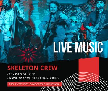 Announcing our band for Cave Capers on Saturday night, Skeleton Crew! The Saturday night party will be the place to be! IYKYK. Diverse and high powered grooves with some outlaw country flair. Come party the night away with these boys from Indiana's own Terre Haute.